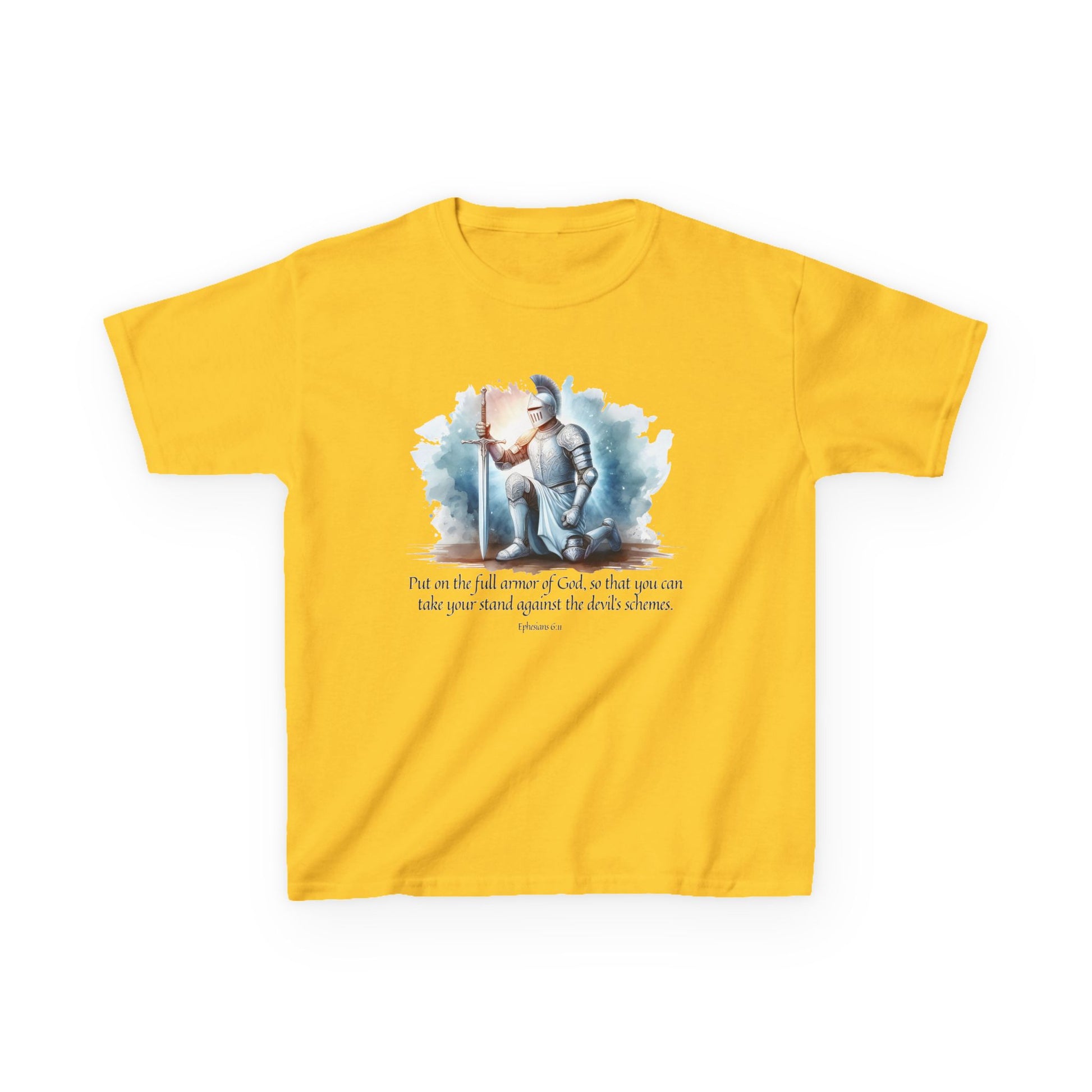 .: Front: A warrior kneeling and holding a sword. It is written "Put on the full armor of God, so that you can take your stand against the devil's schemes. [Ephesians 6:11]"