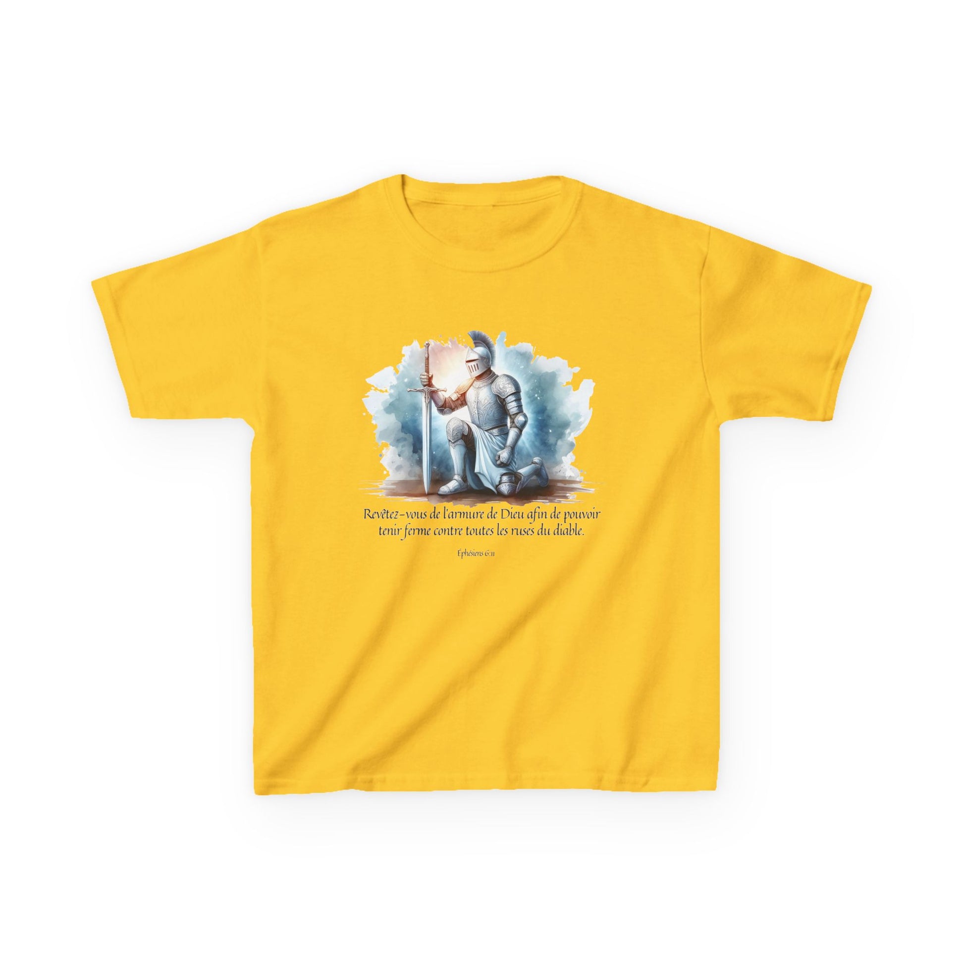.: Front: A warrior kneeling and holding a sword. It is written "Revêtez-vous de l'armure de Dieu afin de pouvoir tenir ferme contre toutes les ruses du diable. [Éphésien 6:11]"