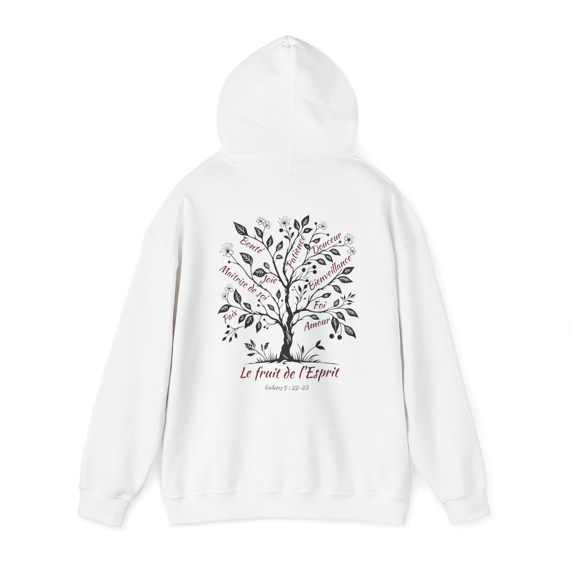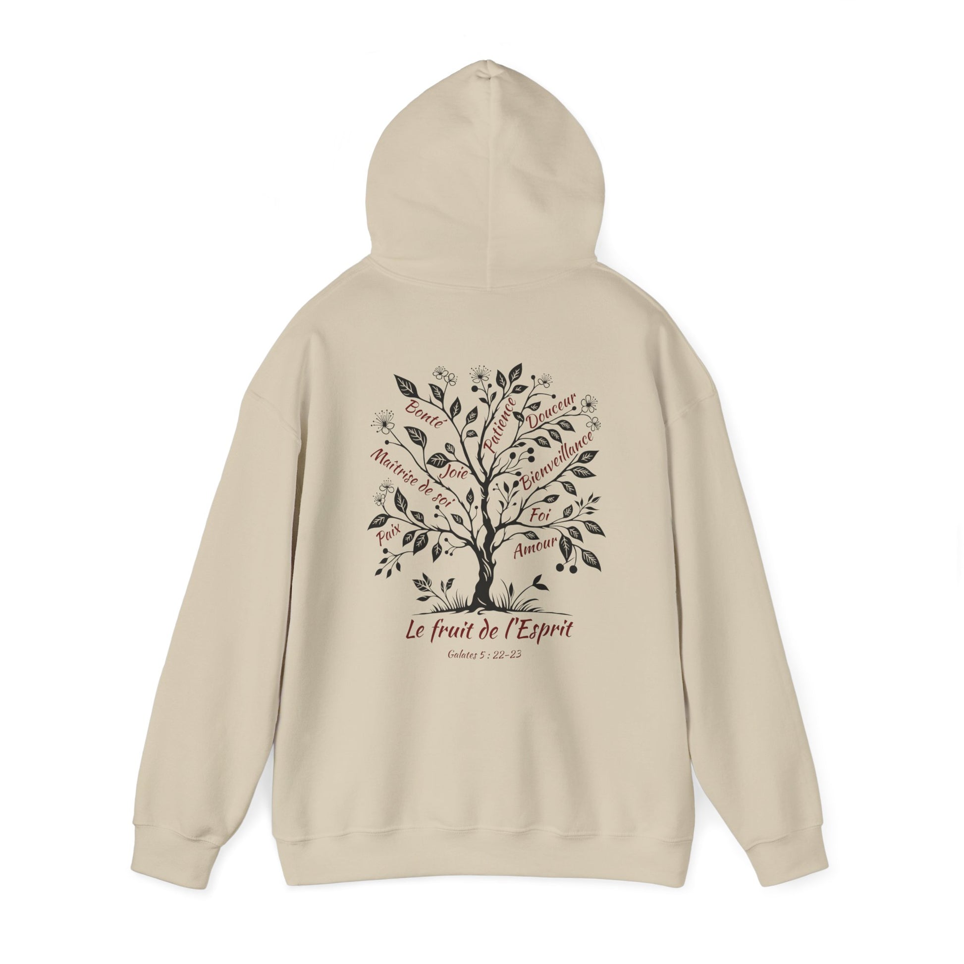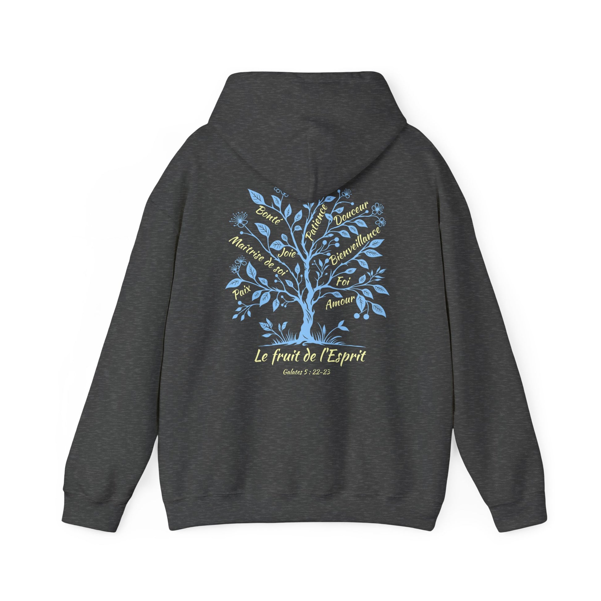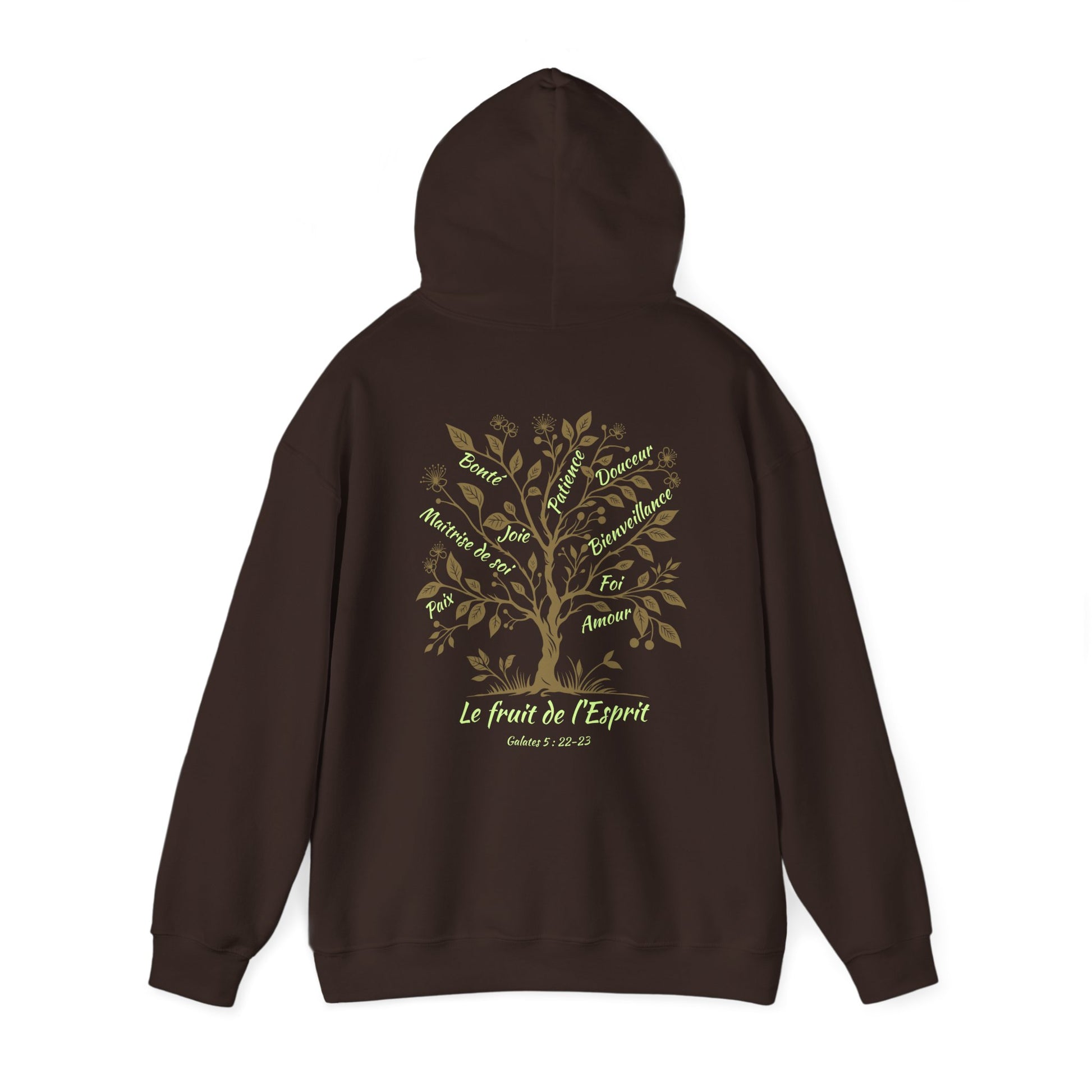 .: Back: A tree with the following words as fruits "Bonté, Patience, Douceur, Joie, Bienveillance, Maîtrise de soi, Foi, Paix, Amour" Sous l'arbre est écrit "Le fruit de l'Esprit [Galates 5:22-23]"