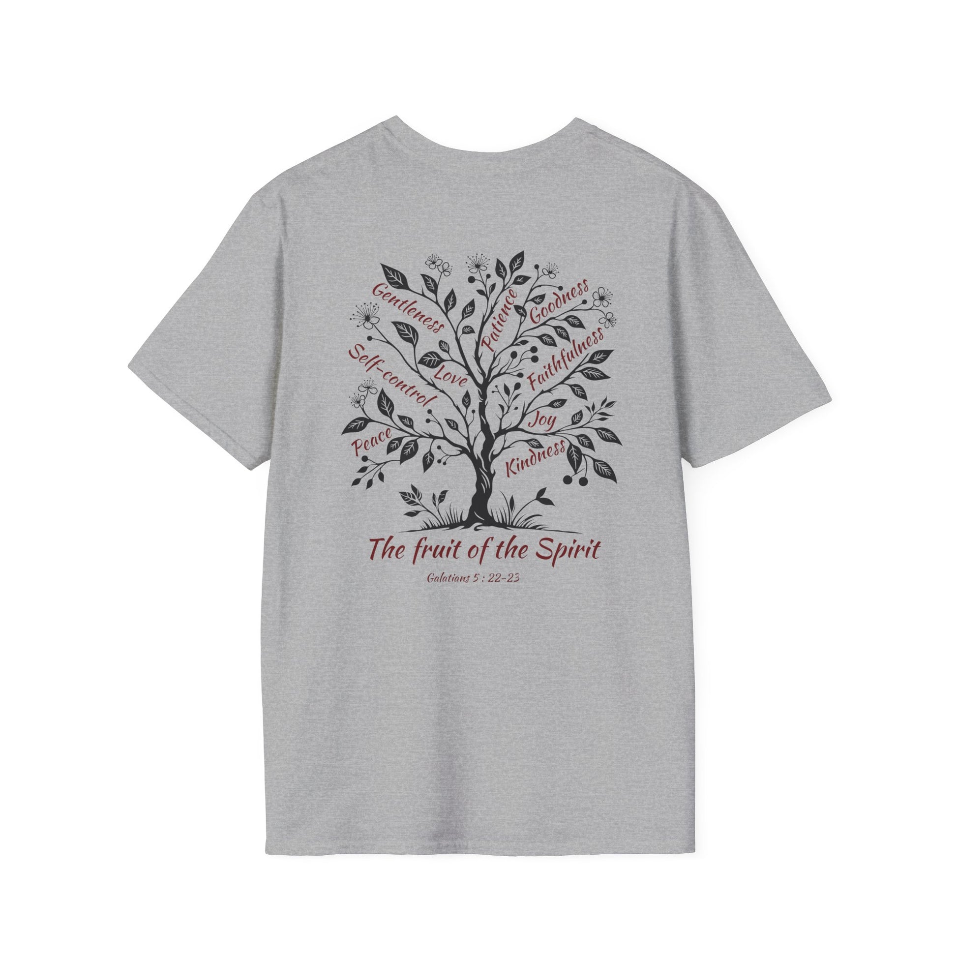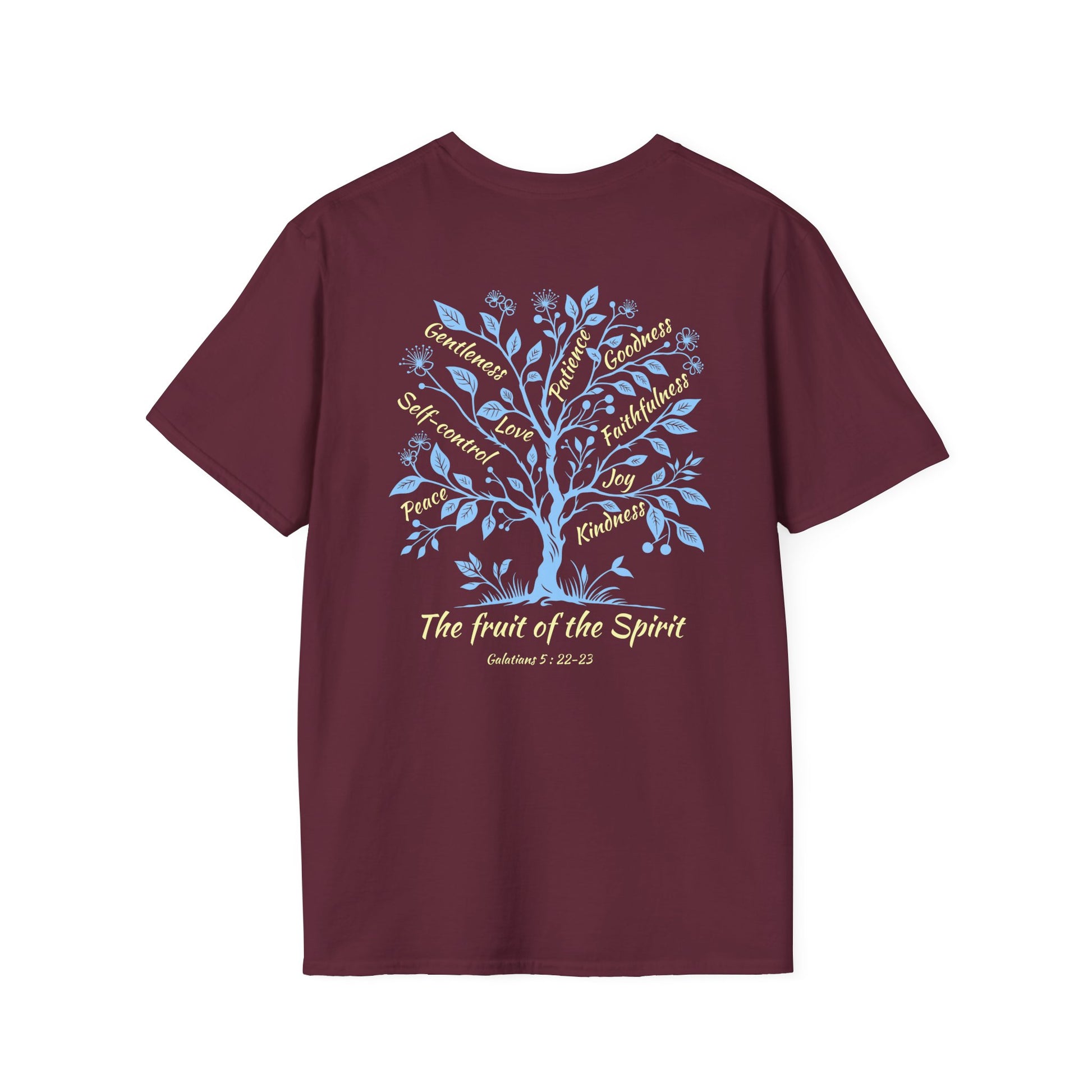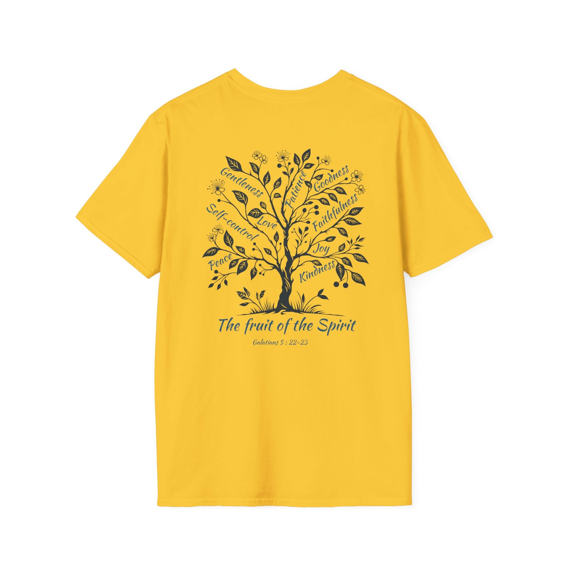 .: Back: A tree with the following words as fruits "Gentleness, Patience, Goodness, Self-control, Love, Faithfulness, Peace, Joy, Kindness" Beneath the tree is written "The fruit of the Spirit [Galatians 5:22-23]"