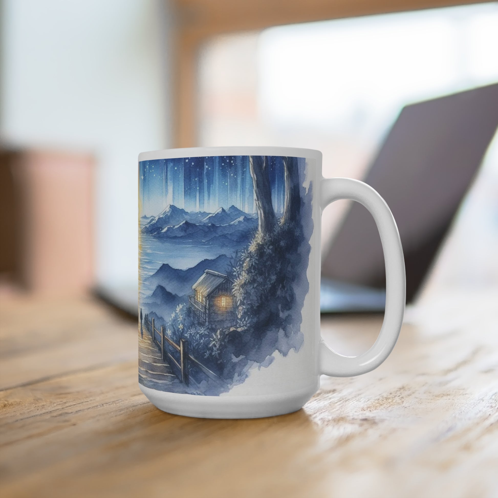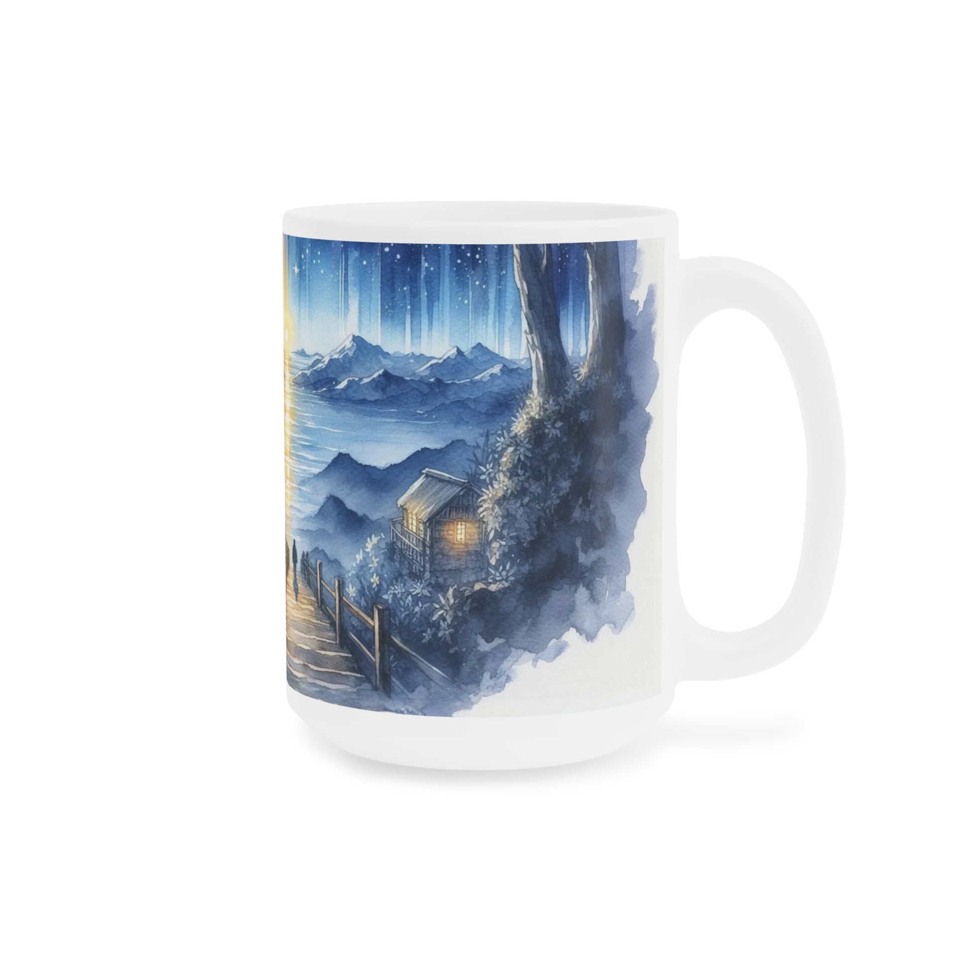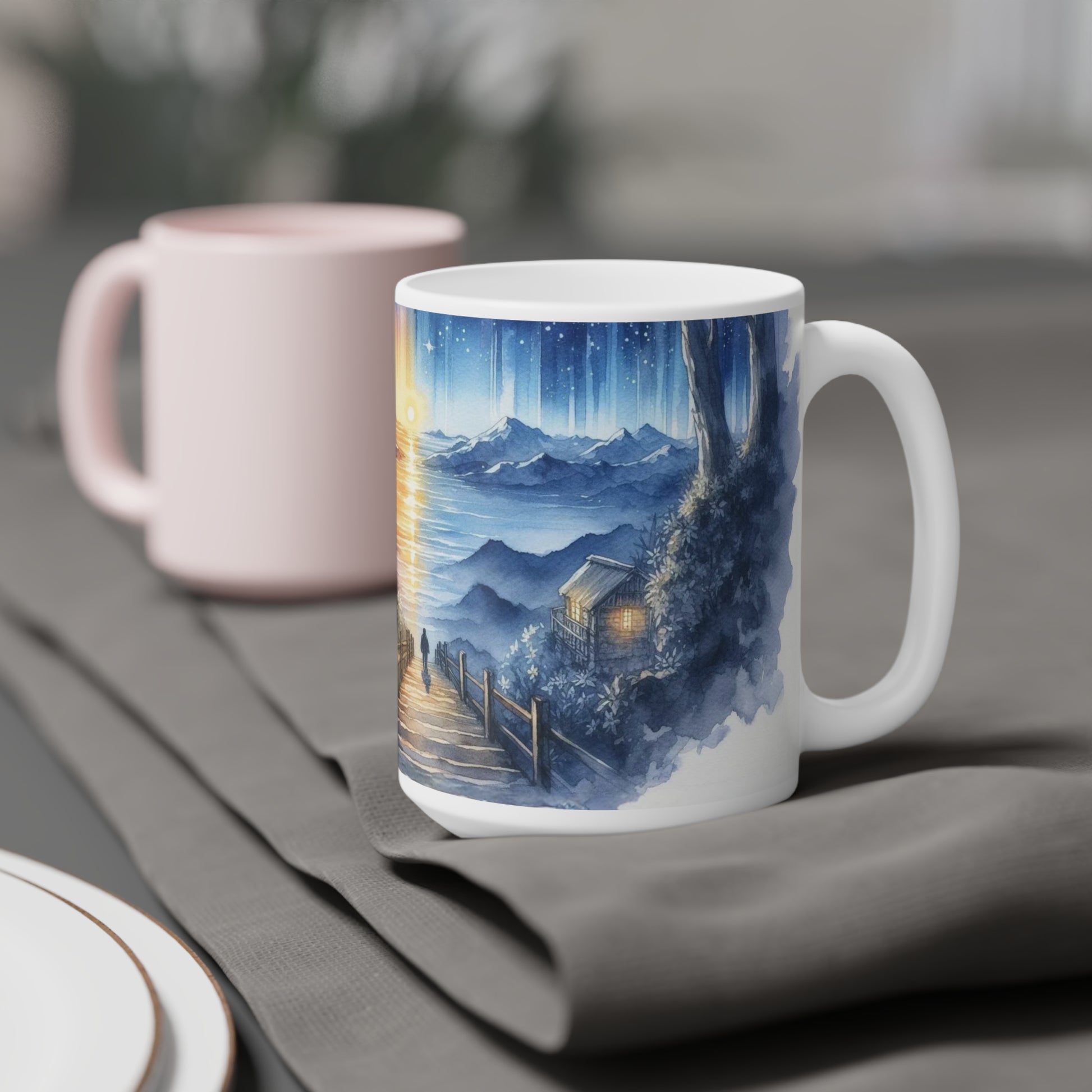 .: Design: A person walking down a path and looking at water and mountains featuring a sky that showing day and night at the same time.