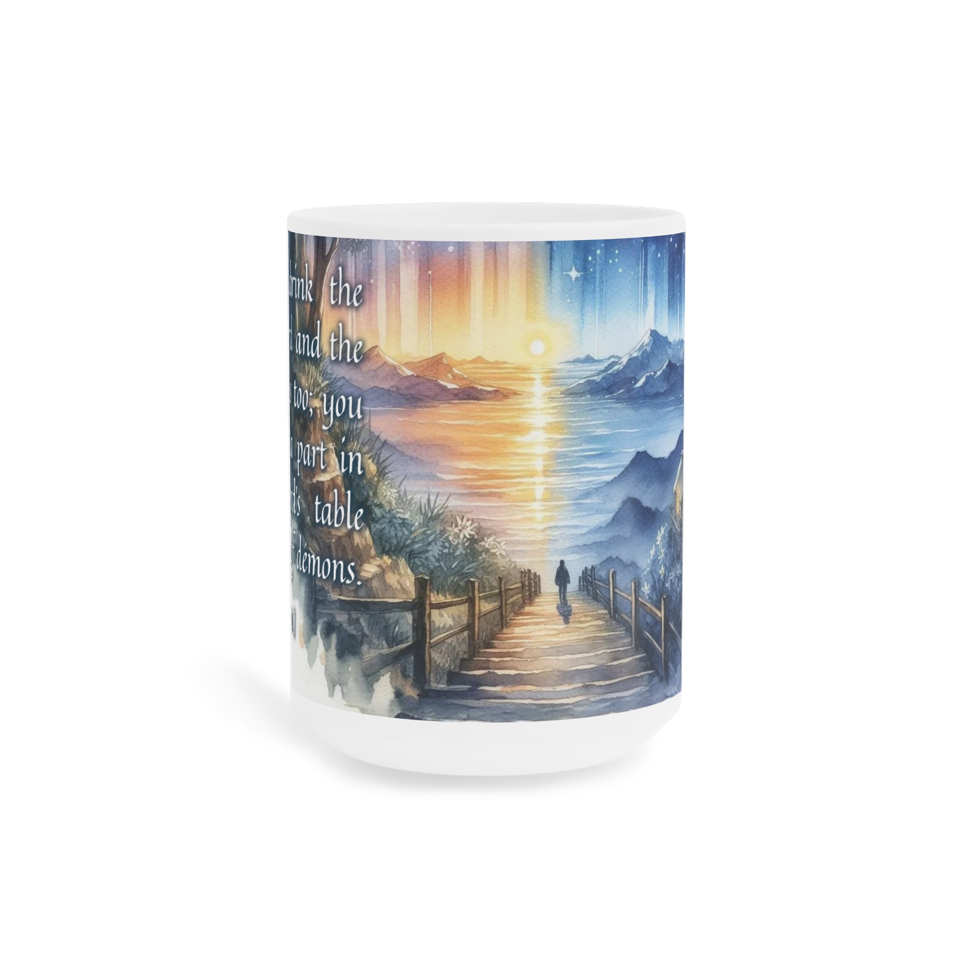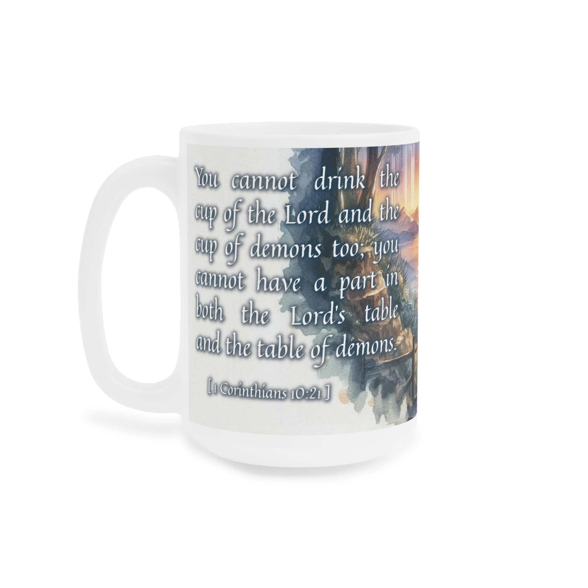 .: Left side: "You cannot drink the cup of the lord and the cup of demons too; you cannot have a part in both the Lord's table and the table of demons. [1 Corinthians 10:21]"