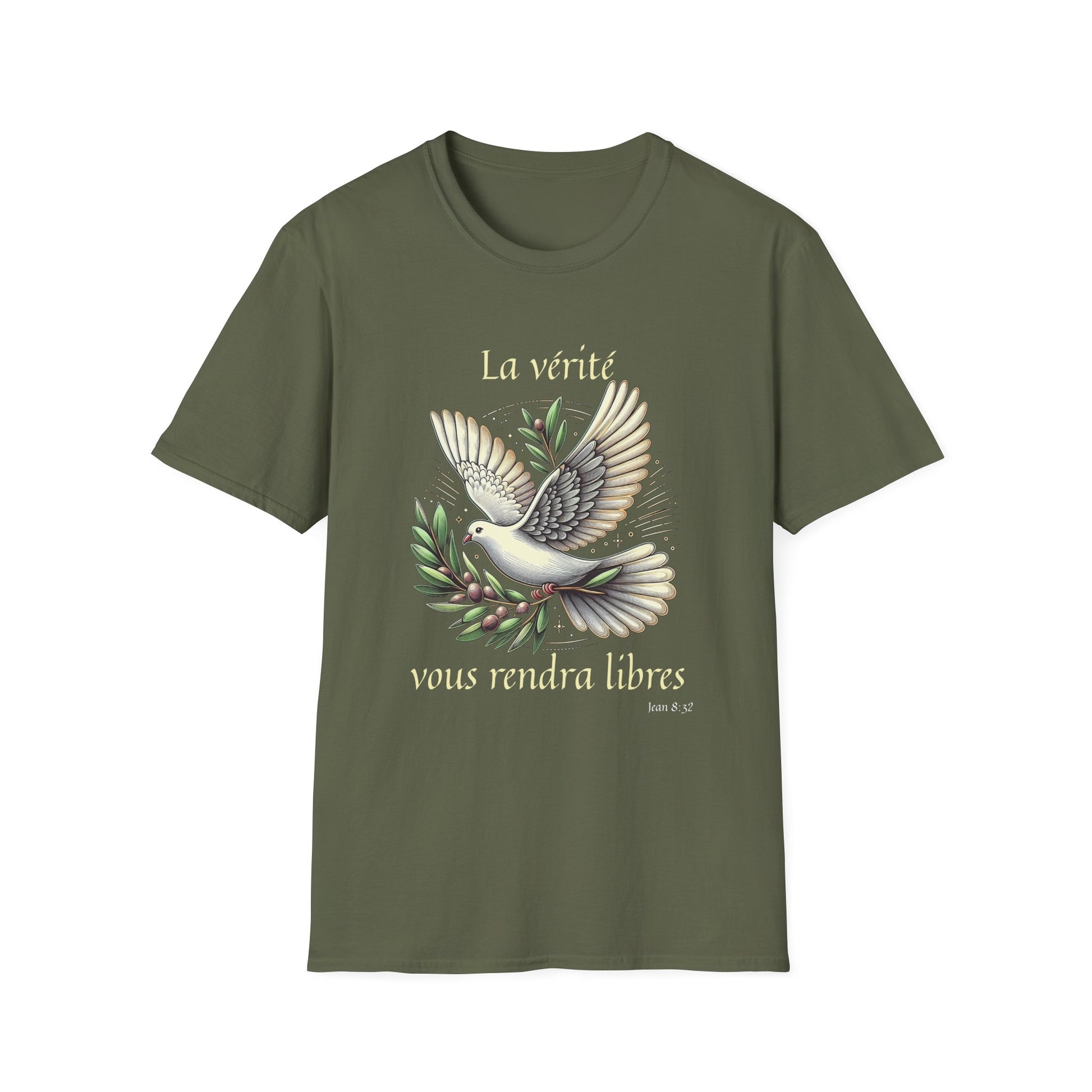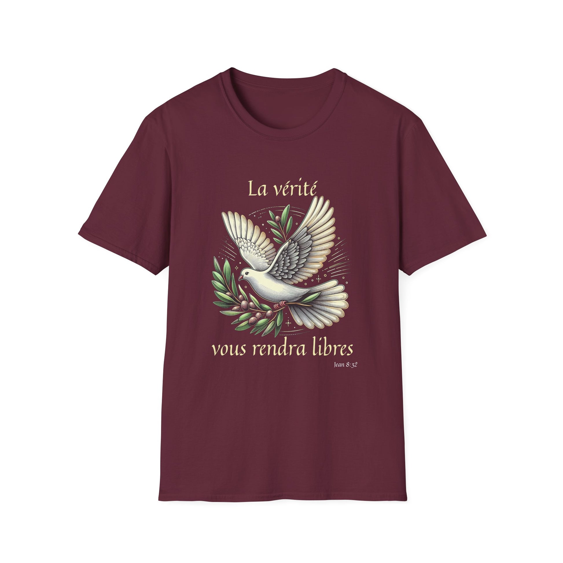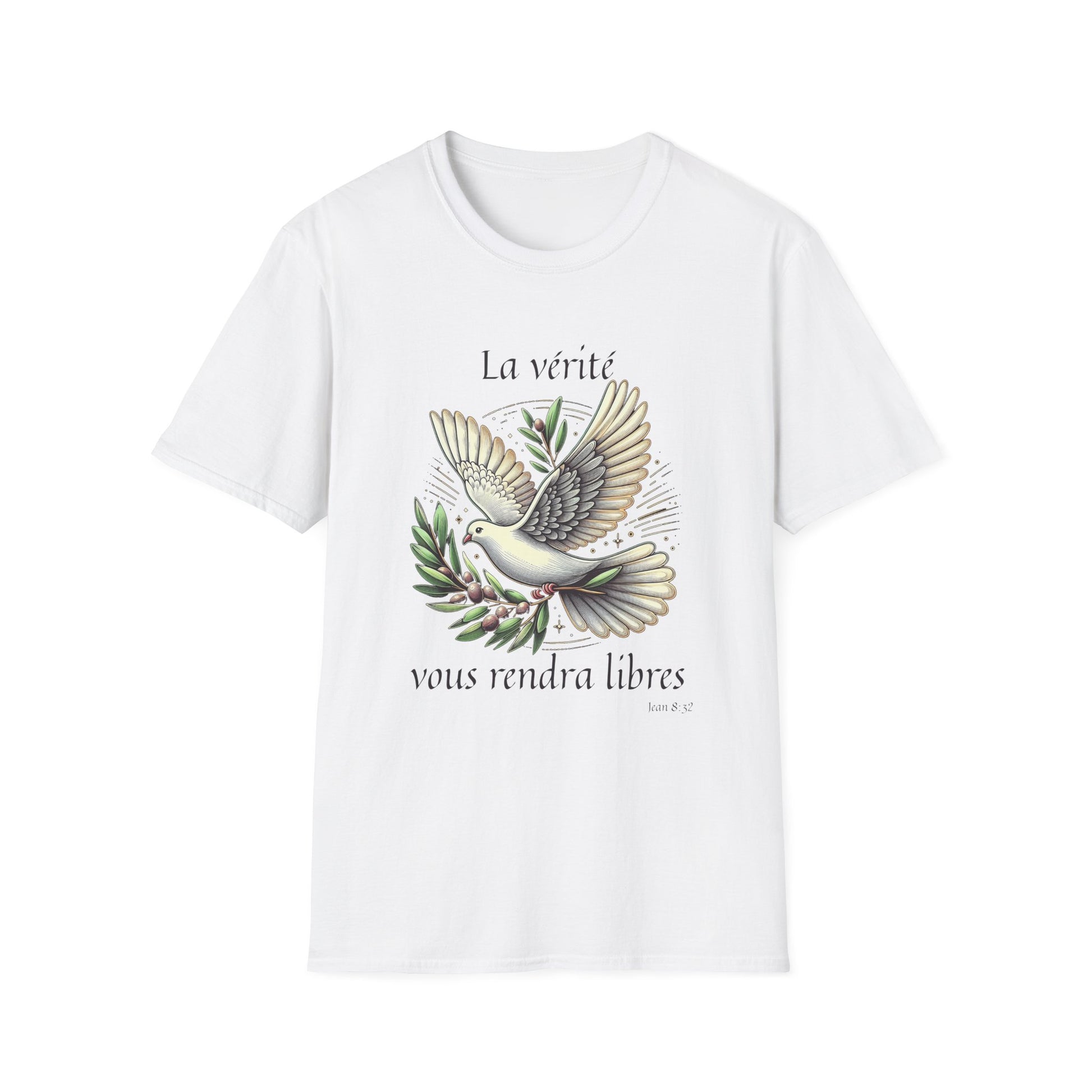 .: Front: A dove carrying an olive branch. The text reads "La vérité vous rendra libres [Jean 8:32]"